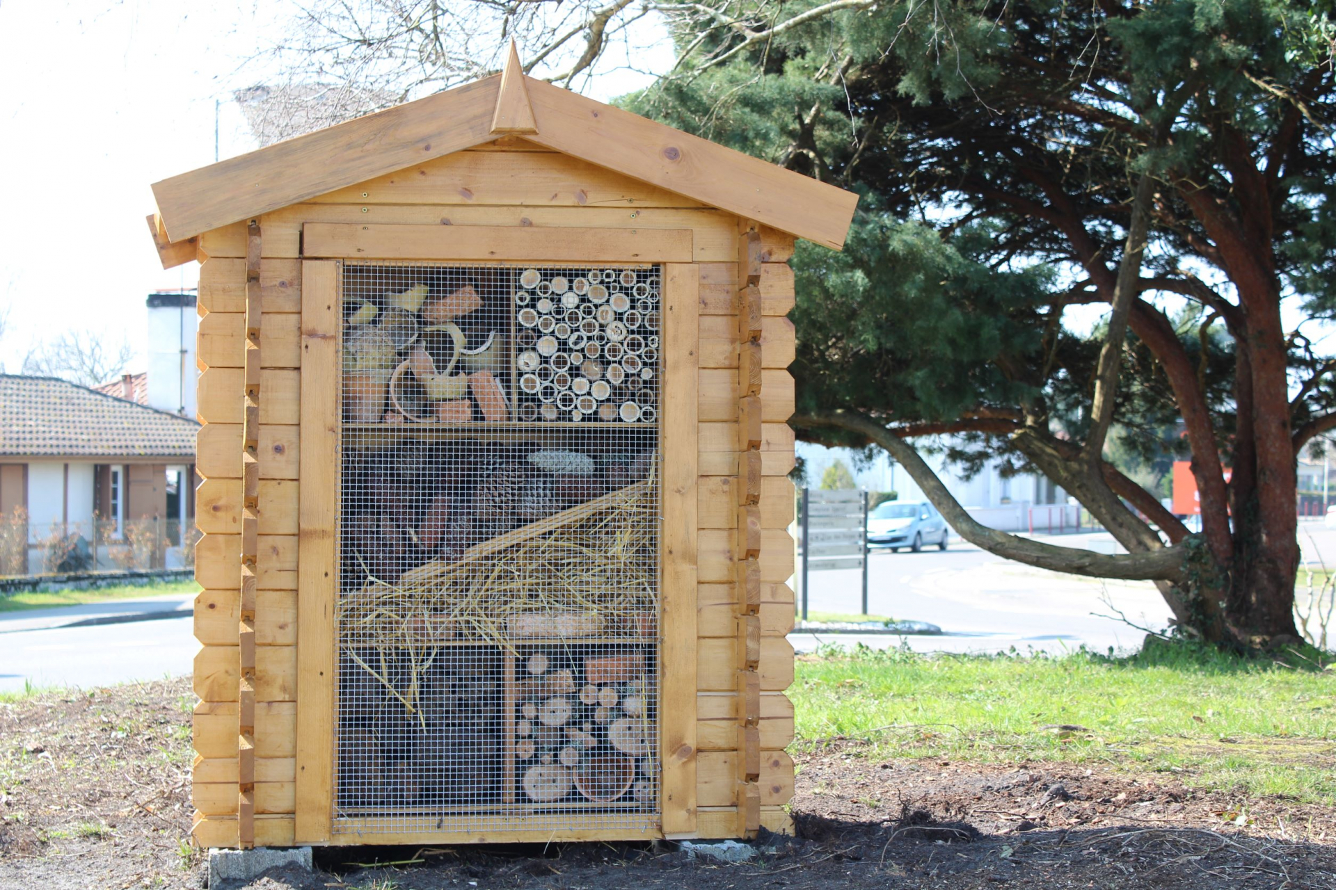 Afin de valoriser le recyclage et l’éco-citoyenneté, un hôtel à insectes a été construit par le pôle technique et a tout naturellement trouvé sa place sur le rond-point de la salle des fêtes, fraîchement débroussaillé.